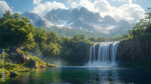 © Visual AI Engine, Fototapeta premium Majestic waterfall cascading down rocky cliffs into a serene lake with snow-capped mountains in the background.