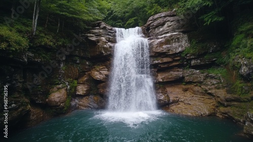 Fototapeta premium Majestic waterfall cascading down rocky cliffs into a serene pool, surrounded by lush green forest.