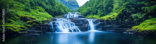 Fototapeta premium Majestic Waterfall Cascading Down Rocky Cliffs Surrounded by Lush Green...