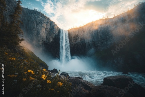 © Godfidence, Fototapeta premium Majestic waterfall cascading down rocky cliffs surrounded by lush greenery and vibrant flowers at sunset