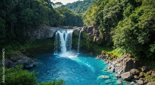Fototapeta premium Majestic waterfall cascading into a vibrant blue pool surrounded by lush,...