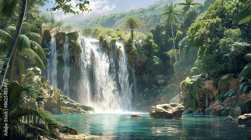 Fototapeta premium Majestic Waterfall Cascading into Crystal-Clear Pool: Tropical Paradise with...