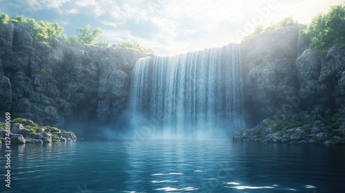 Fototapeta premium Majestic waterfall cascading into serene pool amidst lush greenery under a...