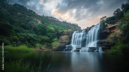 Fototapeta premium Majestic waterfall cascading into tranquil pool, lush greenery backdrop, sunset sky