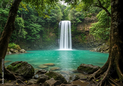 Fototapeta premium Majestic Waterfall Cascading into Turquoise Pool Framed by Lush Greenery and...