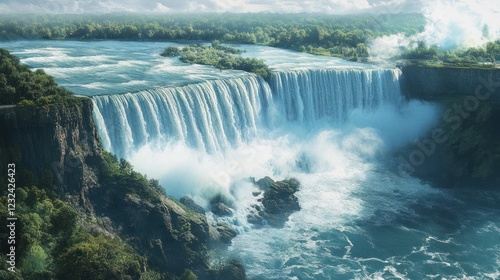 © Zeva, Fototapeta premium Majestic waterfall cascading, lush greenery, sunny day, travel background