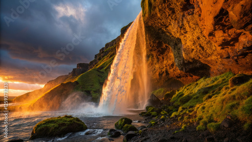 Fototapeta premium Majestic waterfall cascading over golden cliffs into azure waters, surrounded...