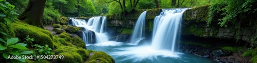 Obraz premium Majestic waterfall cascading over mossy rocks, lush green foliage , beauty,...