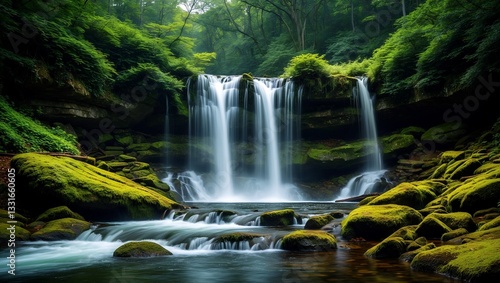 © Artem, Obraz premium Majestic waterfall cascading through a lush forest