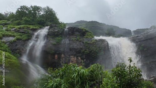 © sumit, Fototapeta premium Majestic Waterfall Cascading through Lush Green Hills and Rocks
