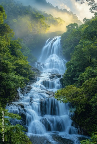 Fototapeta premium Majestic Waterfall Cascading Through Lush Green Jungle Hills Under Soft Morning Light