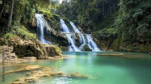 © Kanisorn, Naklejka premium Majestic Waterfall Cascading Through Lush Jungle Canopy, Serene Nature Landscape Scene.