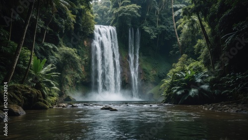 © AkuAku, Fototapeta premium Majestic Waterfall Cascading Through Lush Jungle Surrounded by Vibrant Tropical Foliage and Serene Water Reflections