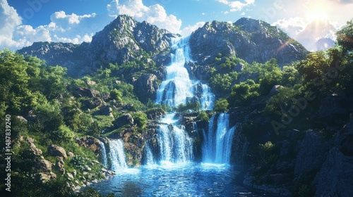 Fototapeta premium Majestic waterfall cascading through lush mountains nature landscape bright...