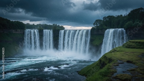© Giovanni, Fototapeta premium Majestic Waterfall Cascading Under Dark Stormy Skies with Lush Greenery Surrounding the Powerful Rapids