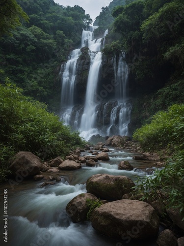 © Tamazina, Naklejka premium Majestic waterfall crashes down rocky cliff, surrounded by lush greenery. Mist rises from impact, creating serene scene. Tranquil stream winds through foreground, bordered by large stones.