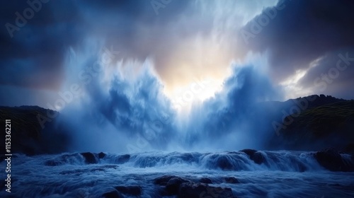 © TYSAMPON, Fototapeta premium Majestic Waterfall Crashing Over Rocks at Dusk