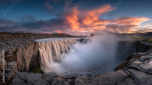 © Yusup, Fototapeta premium Majestic Waterfall During Sunset with Dramatic Clouds and Vibrant Sky