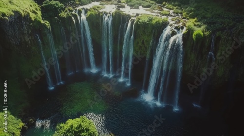 Naklejka premium Majestic Waterfall Flowing into Serene Pool Surrounded by Lush Greenery and...