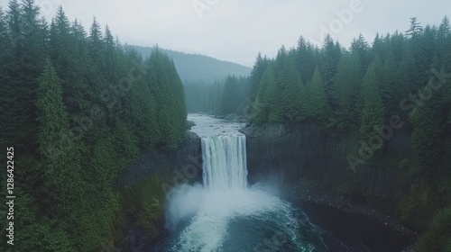 © Biancaart, Fototapeta premium Majestic Waterfall Flowing Through Forest Landscape on a Cloudy Day
