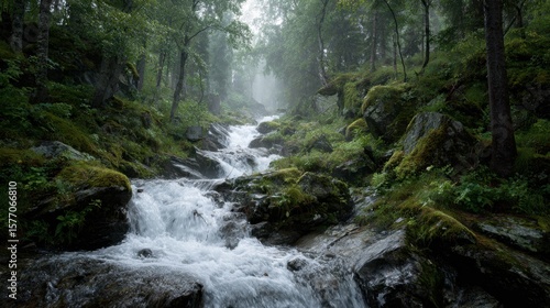 © Angelo, Obraz premium Majestic waterfall flowing through lush forest nature scene tranquil environment serene viewpoint peaceful concept