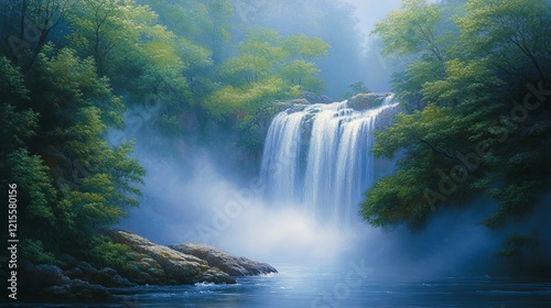 Fototapeta premium Majestic waterfall flows gently through lush greenery in a tranquil natural...