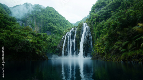 © Kevin, Obraz premium Majestic Waterfall in a Dense Tropical Rainforest
