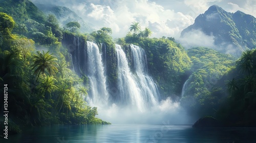 © Nawarit, Fototapeta premium Majestic waterfall in a tropical jungle, mist rising