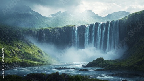 Fototapeta premium Majestic Waterfall in Green Mountain Landscape Nature Photography Travel Destination