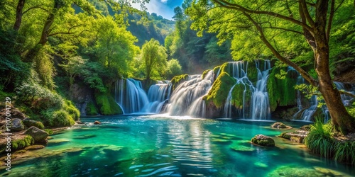 © Danicha, Obraz premium Majestic Waterfall in the Lush Forest of Albania Surrounded by Vibrant Greenery and Crystal-Clear Water, Capturing Nature's Serenity and Beauty in a Breathtaking Landscape Scene
