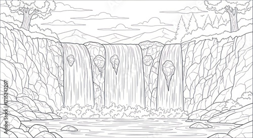 © Fandi Comp, Fototapeta premium Majestic waterfall landscape drawing