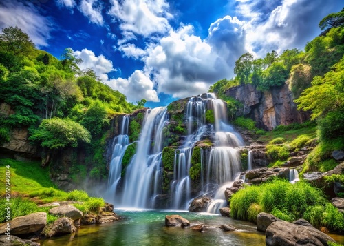 © Man888, Fototapeta premium Majestic Waterfall Landscape: Lush Greenery, Blue Sky, Serene Nature Scene