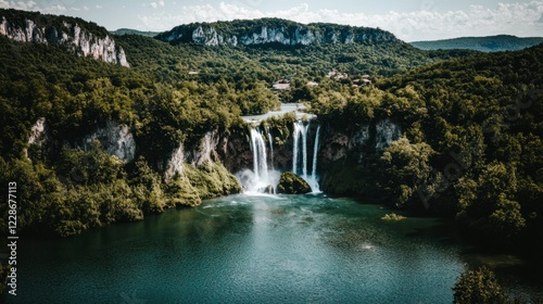 © BOJOShop, Fototapeta premium Majestic Waterfall Lush Green Forest Serenity Nature Landscape Photography