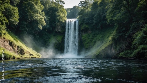 © -Quantum Pixels-, Obraz premium Majestic Waterfall Surrounded by Lush Greenery and Mist Over Serene River in a Natural Landscape Setting