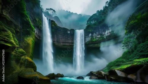 Fototapeta premium Majestic waterfall surrounded by lush greenery during a misty morning