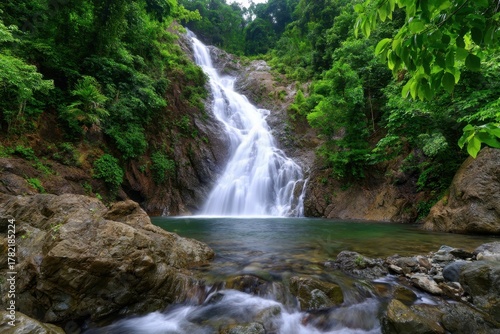 Fototapeta premium Majestic waterfall surrounded by lush greenery in a tropical forest setting