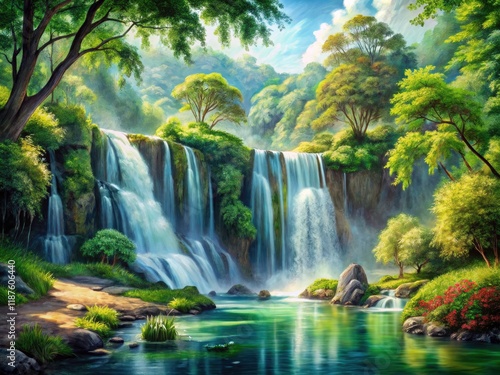 Obraz premium Majestic Waterfall Watercolor Painting, Lush Forest Landscape, Green Nature, Wall Art, Background, Wallpaper, High-Resolution Image