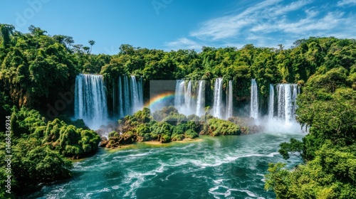 Fototapeta premium Majestic waterfalls cascade into a lush rainforest, a vibrant rainbow arches...