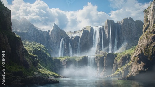 Naklejka premium Majestic Waterfalls Cascading Down a Lush Mountain Gorge