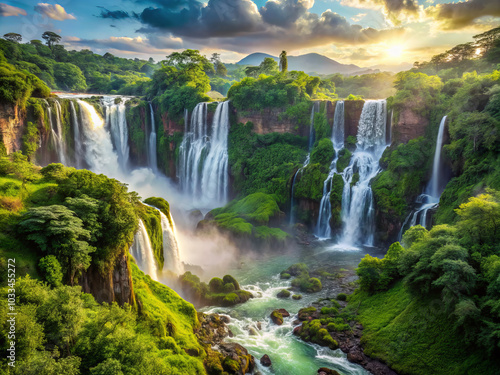 Naklejka premium Majestic waterfalls cascading down steep slopes, surrounded by lush greenery and vibrant landscapes, create breathtaking natural scene. sunlight enhances beauty of this serene environment