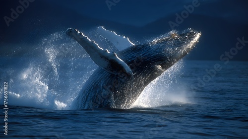 © kirania, Fototapeta premium Majestic whale breaches ocean surface with dramatic spray at dusk.