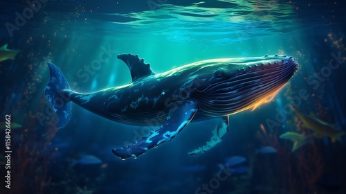 Naklejka premium Majestic whale breaching through a glowing bioluminescent seascape creating a dynamic and captivating underwater scene