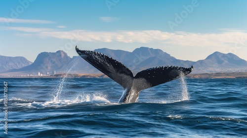 Fototapeta premium Majestic whale's towering tail fluke rising from deep blue ocean against distant rugged mountains