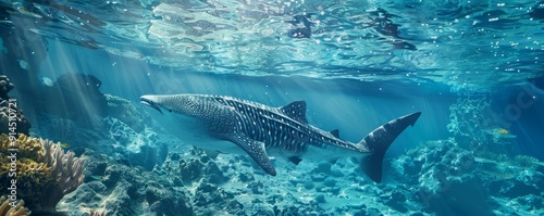 Fototapeta premium Majestic whale shark cruising through crystal-clear waters, 4K hyperrealistic...