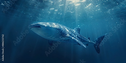 © Thares2020, Fototapeta premium Majestic Whale Shark Feeding Near the Serene Ocean Surface in High Detail