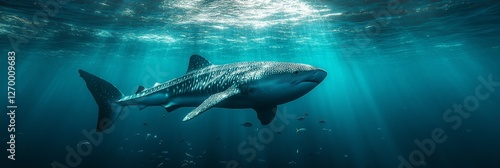 Naklejka premium Majestic Whale Shark Glides Through Sun-Dappled Ocean Depths, Surrounded by Small Fish