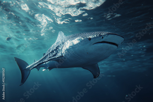 Fototapeta premium Majestic Whale Shark Swimming in the Ocean - A whale shark gracefully glides through the crystal-clear ocean water, its massive size and distinctive spots making it a truly awe-inspiring sight. The sh