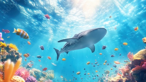 Fototapeta premium Majestic Whale Shark Swimming in Vibrant Coral Reef