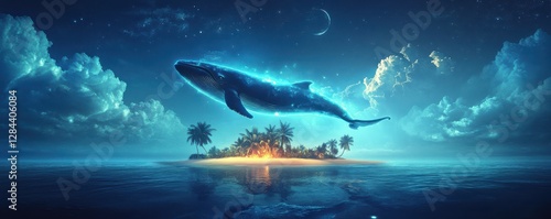 Fototapeta premium Majestic whale soars over tropical island at night with crescent moon