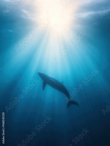 Fototapeta premium majestic whale swims gracefully beneath shimmering ocean surface, illuminated by sunlight